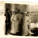 Rok 1954. Szpital w Giżycku. Oddział chirurgiczny – sala ortopedyczna. Obchód lekarski. Młodsza pielęgniarka Janina Gorlo (później Sztomber) stoi pierwsza z prawej.