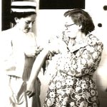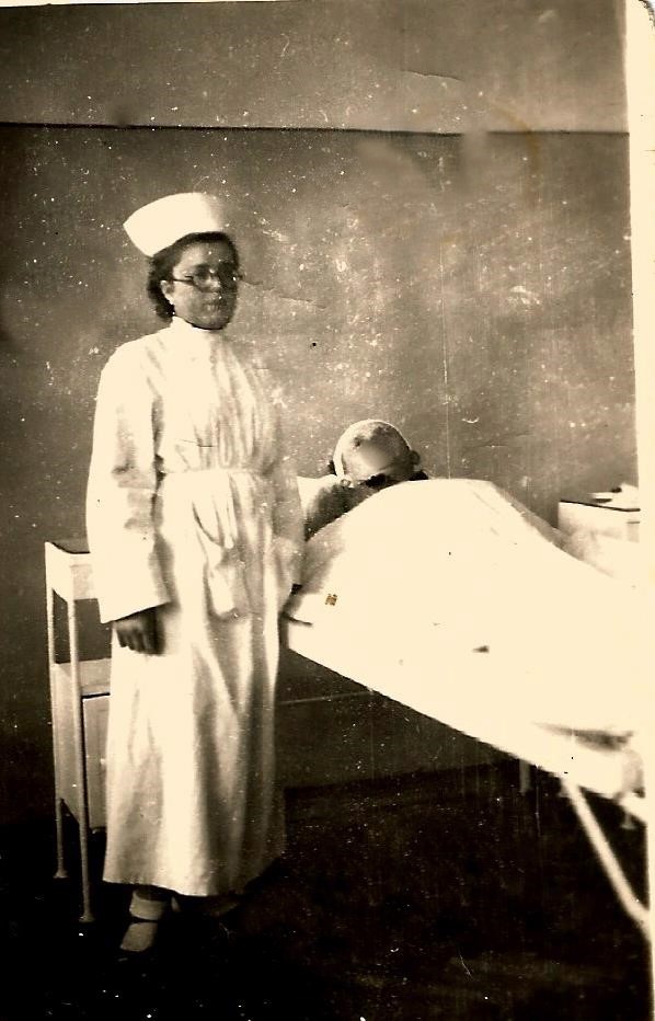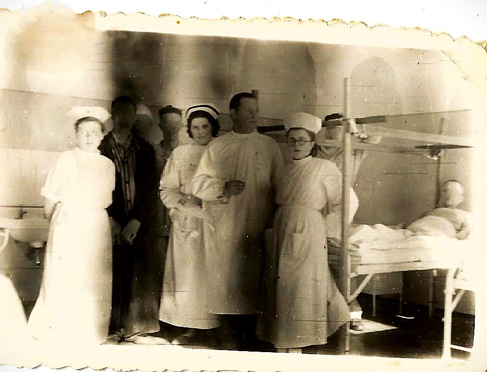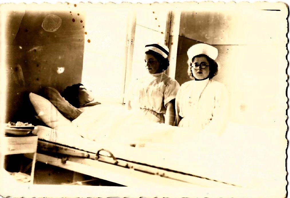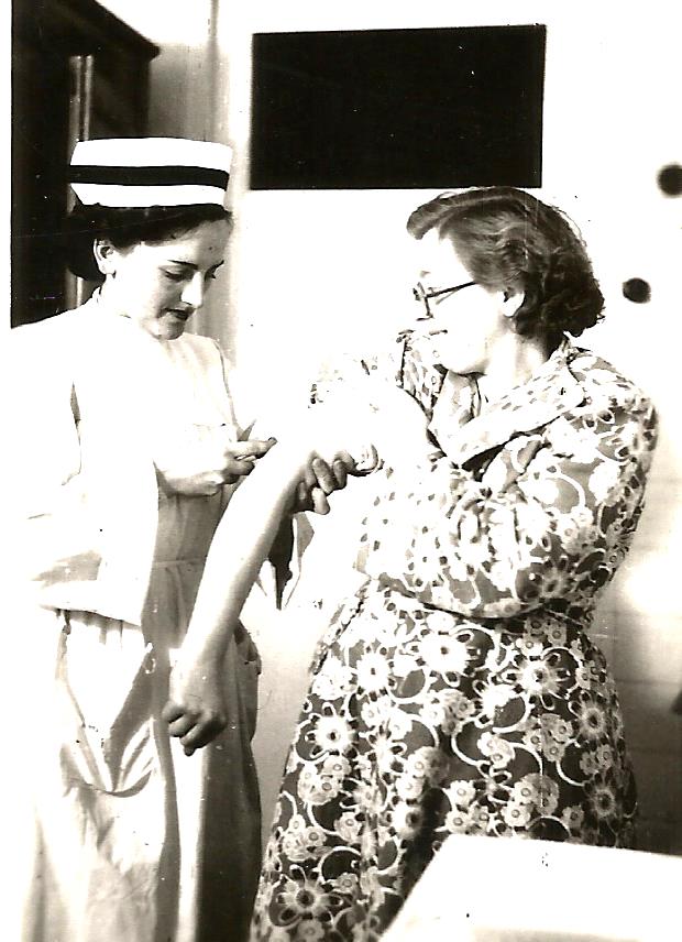 Lato 1952 r. Oddział Dziecięcy Szpitala w Olecku. Zmiana opatrunku u małego pacjenta, który uległ poparzeniu na plecach. Z lewej strony pielęgniarka -Elwira Mońko (później Tuchlińska). Z prawej strony Stanisława Szakur – pierwsza pielęgniarka z Olecka zatrudniona od 1945 r. Bardzo doświadczona, pochodząca z Wilna, przedwojenna pielęgniarka, która dla młodych koleżanek była mistrzynią zawodową i bardzo dużo je nauczyła z zakresu fachowego pielęgniarstwa. Była dla młodszych koleżanek wielkim wzorcem.
