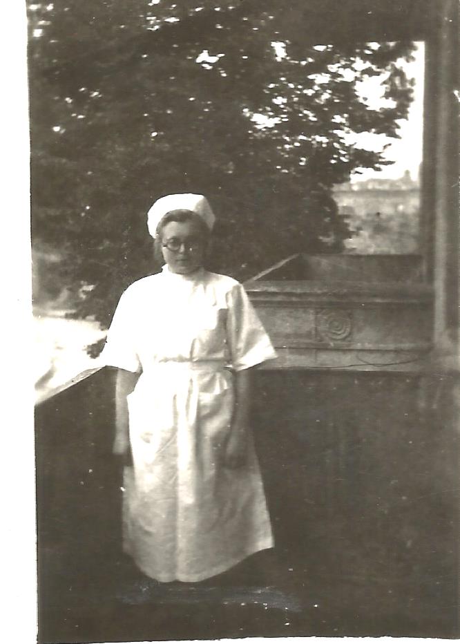 Młodsza pielęgniarka Janina Sztomber (z d. Gorlo ) przed wejściem do budynku Oddziału zakaźnego szpitala w Giżycku – 1957 r.