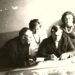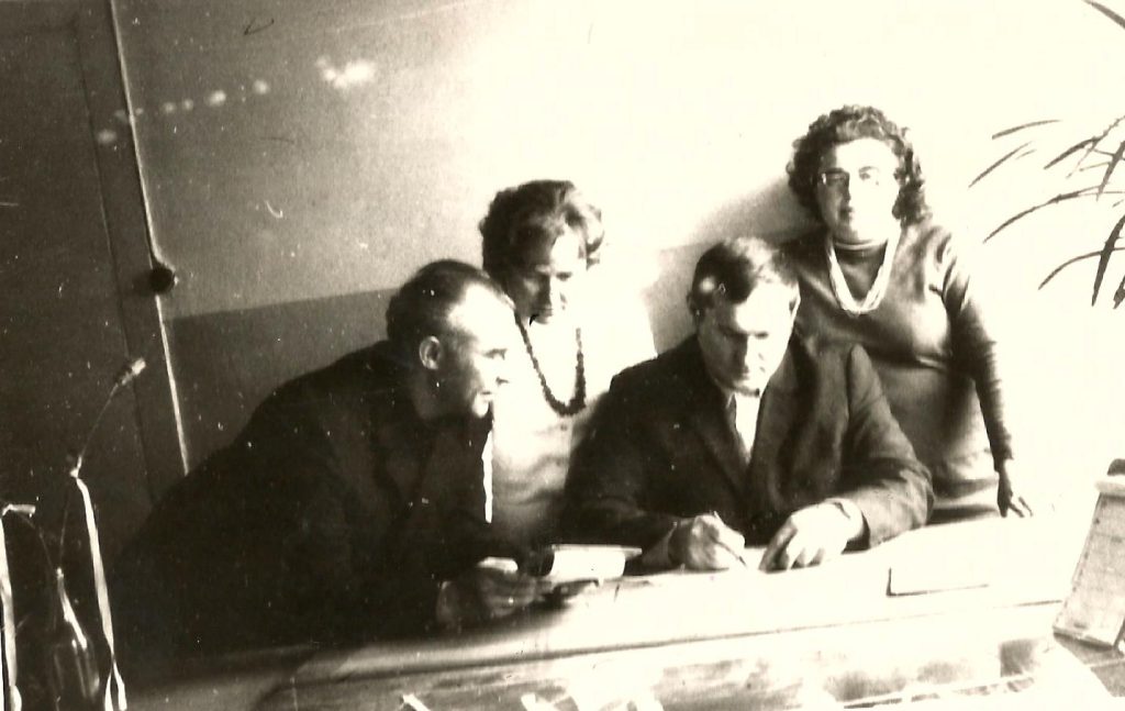 1968 r. Pracownicy Powiatowej Stacji Sanitarno-Epidemiologicznej w Olecku: od lewej kontroler sanitarny po linii urządzeń komunalnych – Mieczysław Tumasz, pielęgniarka ds. szczepień ochronnych –Elwira Tuchlińska, kontroler sanitarny ds. żywienia Wacław Sobolewski, pielęgniarka epidemiologiczna Janina Sztomber. Opracowywanie ogniska czerwonki na podstawie wyników kontroli (została ustalona wtedy przyczyna – przyjęcie mleka od zakażonej krowy przez punkt mleczarski).