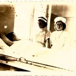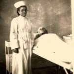 25.11.1955 r. Szpital w Giżycku – Oddział wewnętrzny. Pielęgniarka Janina Gorlo (później Sztomber) przy łóżku pacjenta.