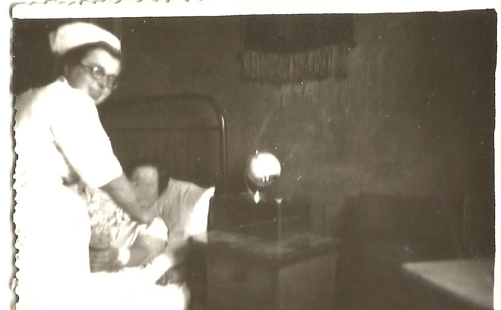 Rok 1955. Szpital w Giżycku – Oddział wewnętrzny. Pielęgniarki Oddziału wewnętrznego przy wykonywaniu zleceń dla leżącej pacjentki. Pierwsza z prawej młodsza pielęgniarka Janina Gorlo (później Sztomber).