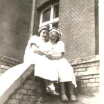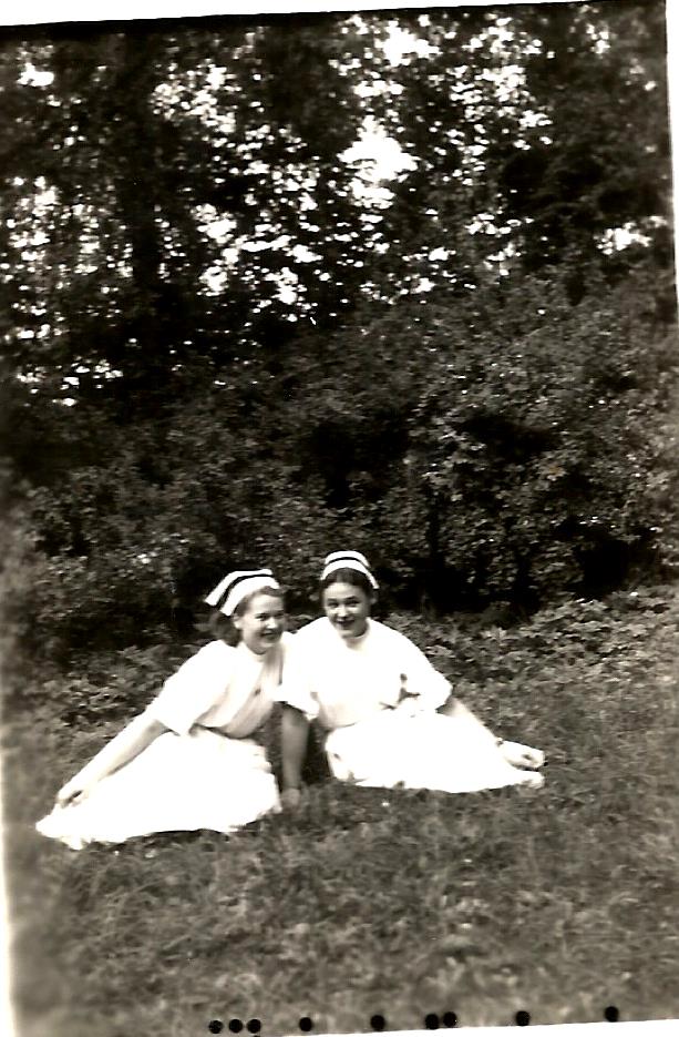 11.05.1954 r. Placyk przed szpitalem w Giżycku. Starsze koleżanki, już pielęgniarki dyplomowane pozują do zdjęcia prezentując z dumą czarne paski na czepkach. Młodsza pielęgniarka Janina Gorlo musiała na to jeszcze ładnych parę lat poczekać a było jej to wielkie marzenie..