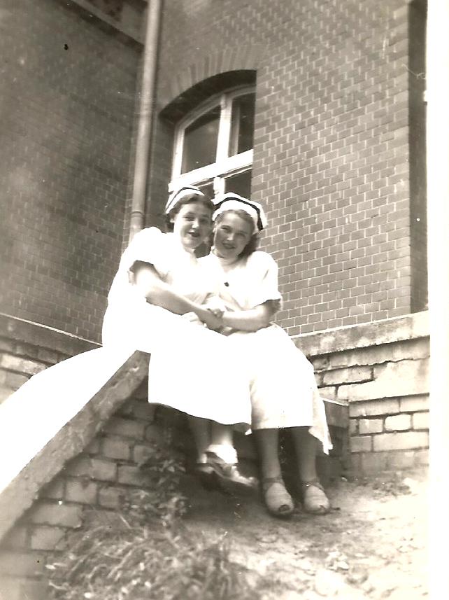 Styczeń 1953 r.- Oleckie pielęgniarki: Elwira Mońko (za 10-m-cy Tuchlińska) – z lewej strony oraz Krystyna Wasilewska w drodze na dyżur popołudniowy na Oddziale Dziecięcym Szpitala w Olecku. Znajomy fotograf spotkał je w centrum Olecka na przeciw zgruzowanego jeszcze od czasów wojny budynku poczty (widoczne ruiny w głębi).